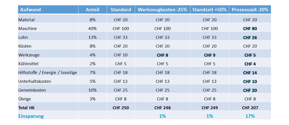 Die Erhöhung der Standzeit um 50% reduziert die Stückkosten um 1%.